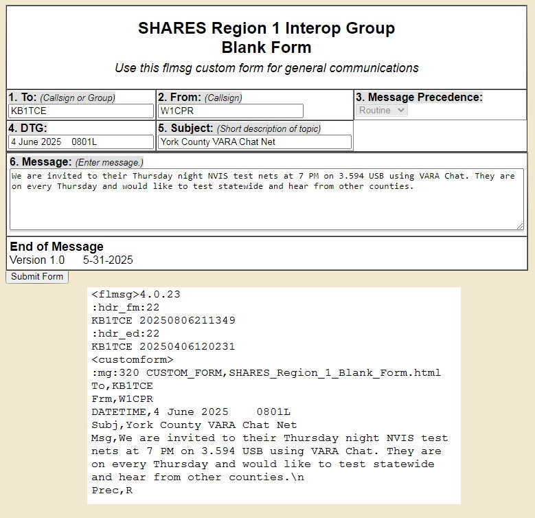 Introduction Where formal communications are required or desired, this group will use 3 custom forms that may be created, edited and printed using flmsg. Flmsg is the formal messaging component of a suite of programs collectively known as the Narrow Band Emergency Messaging System or NBEMS. The programs are authored and supported by Dave Freese W1HKJ. Downloads, Help Files and other information may be found at W1HKJ & Associates. All of the software is cross-platform and open source. The primary NBEMS programs include the modem program fldigi, flmsg and a program (flamp) that can send files in pieces (blocks) where blocks can be repeated to help ensure that the complete file is transferred without errors. While NBEMS is capable of fully error corrected peer to peer (ARQ) connections, the usual mode of operation is one-to-many with forward error corrected (FEC) modes such as Olivia, MT63, THOR and others. Flmsg was developed in 2010 for formal communications over the radio. The software includes a number of message forms such as ICS forms, radiogram, etc. The operator selects the desired form. Once a form type has been selected, the message originator can fill in the fields with the required information. Like most forms programs, such as the widely used Winlink forms, only the data gets sent along with some simple tags that identify the form fields that are associated with the text. The receiving software reconstructs the form making it suitable for viewing, printing or saving (usually as a pdf). The flmsg file can also be sent as an attachment via any electronic method that permits the sending of files. Details on the NBEMS programs are available on the W1HKJ site plus there are many independently produced tutorials available on the web. Some may find the concise NBEMS Guide that was prepared for Maine operators to be useful. The rest of this page will focus on the use of flmsg with one of the custom forms that has been developed for the Interop Group.Why Flmsg? Users of Winlink Express are (or should be) quite familiar with the extensive form set that is available with the program. These forms are unmatched as long as they are used within the Winlink ecosystem i.e. Winlink radio-email, Winlink radio only and Peer to Peer using Winlink Express. The shortcoming occurs when transferring a form from Winlink Express to another communications program. The data will be transferred but the formatting will be lost. Flmsg, while normally used in conjunction with fldigi, is a great stand-alone program for forms. An advantage is that a form created on flmsg can be transmitted via any electronic means that accepts file transfers without losing the formatting. This would include Winlink, VARA Chat, VarAC, packet, email and hand transfer on a thumb drive. All that is needed is that all stations in the network have flmsg. Unlike Winlink Express, flmsg does not have to be registered and non-ham (agency) staff can use it. Another advantage is the use of custom forms. It is fairly simple to create custom forms using basic html. There is also a simplified operator interface that eliminates the clutter of "radio stuff" in the GUI. This will all be explained in the following section. Flmsg User Interfaces Flmsg offers two user interfaces either of which may be selected from the Config - UI menu item. The traditional interface, known as the Expert interface, includes the items needed by a radio operator: mode selection, etc. Includes is a menu for the built in standard forms. It also permits the use of custom forms (html forms created for specific applications or groups). The other interface is the Agency interface. This is simplified and only contains the items needed to create, view, edit and save custom html forms. It has no built in forms. For some historical background on the Agency interface see A Tool for Creating and Transmitting Forms by Radio This was presented at the 2017 Maine Partners in Emergency Preparedness Conference.If you are using flmsg as a standalone that is not tied to fldigi, and you are only using custom forms, the Agency GUI is very clean and efficient. The screen captures below show the UI selection screen (upper left) with Expert unchecked and the Agency interface (lower left). Clicking New Message will bring up a screen that lists the custom forms that have been placed in the C\:user - NBEMS Files - CUSTOM folder. For this example we'll look at the Blank Form that may be used for general ammouncements and so forth. Once the list of forms has been brought up, click the one that you want. This will highlight it. Then click Select. This will bring up the form in your browser. You may then fill out the form. For forms that have already been created, for example a received form or an existing form where you wish to edit the content, you can select View to see the form or queue it for printing, or Edit if you wish to make modifications. For example, if you receive a form with a Reply field, you would use the Edit button. | |||||||