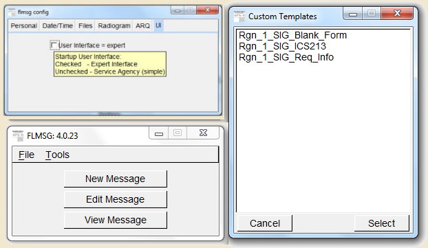 Introduction Where formal communications are required or desired, this group will use 3 custom forms that may be created, edited and printed using flmsg. Flmsg is the formal messaging component of a suite of programs collectively known as the Narrow Band Emergency Messaging System or NBEMS. The programs are authored and supported by Dave Freese W1HKJ. Downloads, Help Files and other information may be found at W1HKJ & Associates. All of the software is cross-platform and open source. The primary NBEMS programs include the modem program fldigi, flmsg and a program (flamp) that can send files in pieces (blocks) where blocks can be repeated to help ensure that the complete file is transferred without errors. While NBEMS is capable of fully error corrected peer to peer (ARQ) connections, the usual mode of operation is one-to-many with forward error corrected (FEC) modes such as Olivia, MT63, THOR and others. Flmsg was developed in 2010 for formal communications over the radio. The software includes a number of message forms such as ICS forms, radiogram, etc. The operator selects the desired form. Once a form type has been selected, the message originator can fill in the fields with the required information. Like most forms programs, such as the widely used Winlink forms, only the data gets sent along with some simple tags that identify the form fields that are associated with the text. The receiving software reconstructs the form making it suitable for viewing, printing or saving (usually as a pdf). The flmsg file can also be sent as an attachment via any electronic method that permits the sending of files. Details on the NBEMS programs are available on the W1HKJ site plus there are many independently produced tutorials available on the web. Some may find the concise NBEMS Guide that was prepared for Maine operators to be useful. The rest of this page will focus on the use of flmsg with one of the custom forms that has been developed for the Interop Group.Why Flmsg? Users of Winlink Express are (or should be) quite familiar with the extensive form set that is available with the program. These forms are unmatched as long as they are used within the Winlink ecosystem i.e. Winlink radio-email, Winlink radio only and Peer to Peer using Winlink Express. The shortcoming occurs when transferring a form from Winlink Express to another communications program. The data will be transferred but the formatting will be lost. Flmsg, while normally used in conjunction with fldigi, is a great stand-alone program for forms. An advantage is that a form created on flmsg can be transmitted via any electronic means that accepts file transfers without losing the formatting. This would include Winlink, VARA Chat, VarAC, packet, email and hand transfer on a thumb drive. All that is needed is that all stations in the network have flmsg. Unlike Winlink Express, flmsg does not have to be registered and non-ham (agency) staff can use it. Another advantage is the use of custom forms. It is fairly simple to create custom forms using basic html. There is also a simplified operator interface that eliminates the clutter of "radio stuff" in the GUI. This will all be explained in the following section. Flmsg User Interfaces Flmsg offers two user interfaces either of which may be selected from the Config - UI menu item. The traditional interface, known as the Expert interface, includes the items needed by a radio operator: mode selection, etc. Includes is a menu for the built in standard forms. It also permits the use of custom forms (html forms created for specific applications or groups). The other interface is the Agency interface. This is simplified and only contains the items needed to create, view, edit and save custom html forms. It has no built in forms. For some historical background on the Agency interface see A Tool for Creating and Transmitting Forms by Radio This was presented at the 2017 Maine Partners in Emergency Preparedness Conference.If you are using flmsg as a standalone that is not tied to fldigi, and you are only using custom forms, the Agency GUI is very clean and efficient. The screen captures below show the UI selection screen (upper left) with Expert unchecked and the Agency interface (lower left). Clicking New Message will bring up a screen that lists the custom forms that have been placed in the C\:user - NBEMS Files - CUSTOM folder. For this example we'll look at the Blank Form that may be used for general ammouncements and so forth. Once the list of forms has been brought up, click the one that you want. This will highlight it. Then click Select. This will bring up the form in your browser. You may then fill out the form. For forms that have already been created, for example a received form or an existing form where you wish to edit the content, you can select View to see the form or queue it for printing, or Edit if you wish to make modifications. For example, if you receive a form with a Reply field, you would use the Edit button. | |||||||